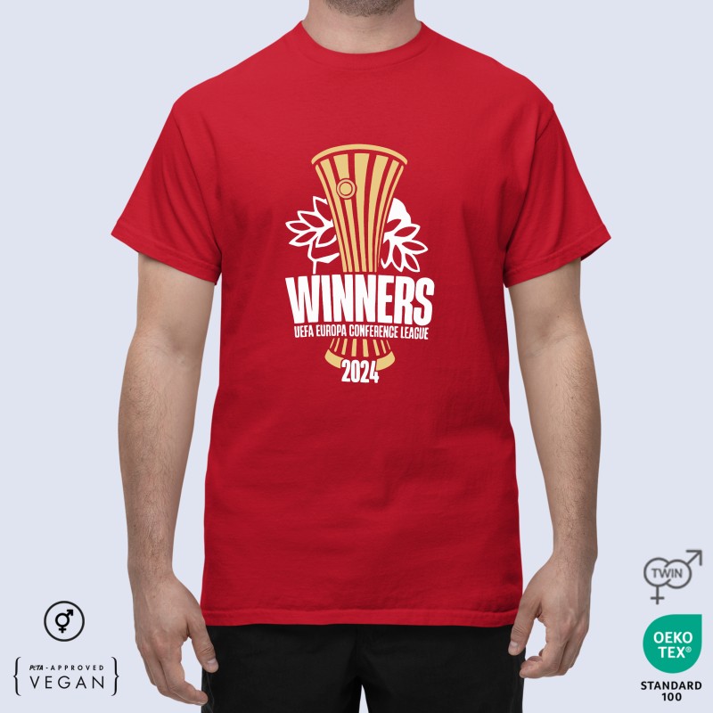 ›Κοντομάνικο Unisex μπλουζάκι με εκτύπωση σχέδιο "Ολυμπιακός 2024 Conference winners Unisex T-shirt" εμπρός και σήμα με αστέρια πίσω ψηλά.