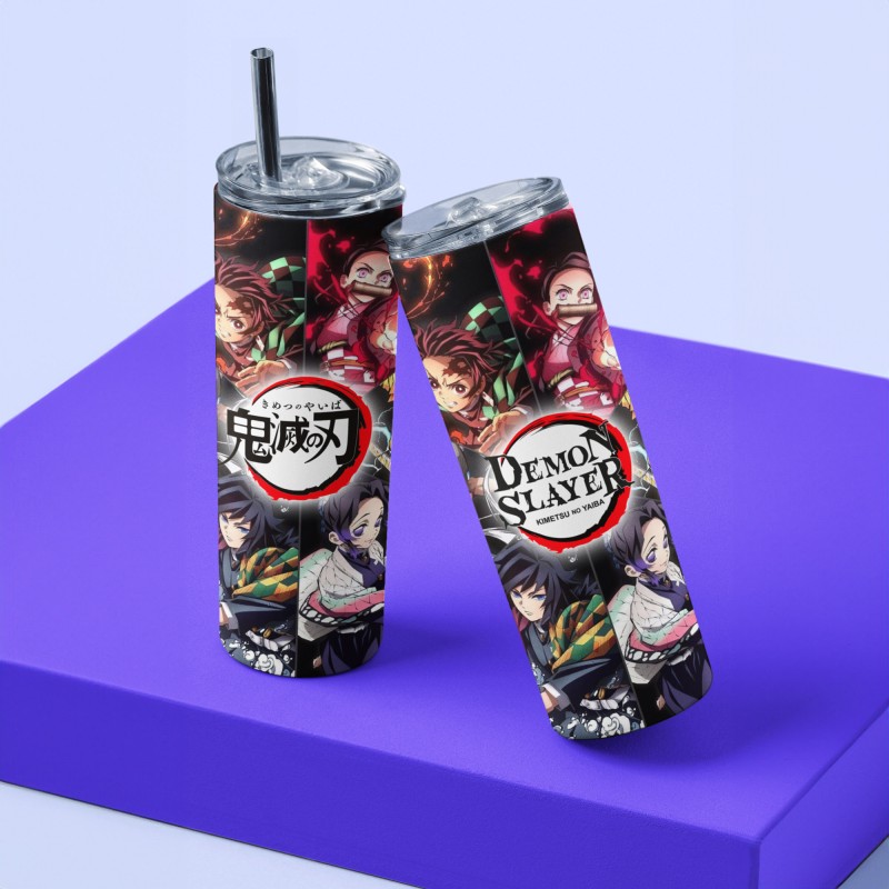 ›30oz skinny tumbler printed with character collage of famous anime series Demon Slayer and logo in English and Japanese version.